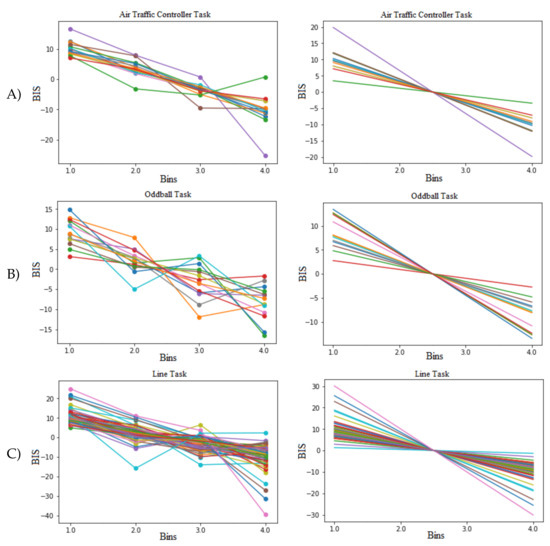 BIS measures and the corresponding best-fit lines for: (A) Air Traffic Controller task (top), (B) Oddball task (middle), and (C) Line task (bottom). The lines represent a participant’s BIS measures over the duration of the task, with lines on the right being best-fit lines. BIS measures vary from bin to bin for each participant, with some participants decreasing steadily throughout the entire task, some decreasing initially and then recovering, or some alternating between decreasing and increasing BIS. Note that every participant’s best-fit line has a negative slope, indicating that every participant’s first bin is their most attentive bin with their largest BIS measure.