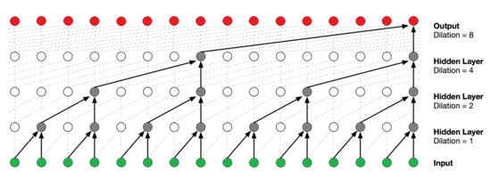 Visual illustration of a causal TCN [61]. This TCN has a block size of 1, a dilation list (1,2,4,8) (i.e., dilation factor 8), and a kernel size of 2. This results in a receptive field of .