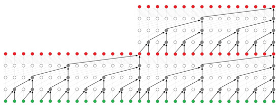 Visual illustration of a causal TCN with stacked blocks [62]. This TCN has a block size of 2, a dilation list (1,2,4,8) (i.e., dilation factor 8), and a kernel size of 2. This results in a receptive field of .
