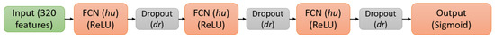 Visual representation of MLPNN classifier. The MLPNN architecture consists of three fully-connected hidden layers with hidden units and the ReLU activation, each followed by a dropout layer with a dropout rate .
