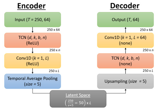 The architecture of the TCN-AE is included below in Figure 9, with the encoder on the left, the decoder on the right, and the latent space in the bottom center. The encoder takes as input the EEG signal with dimensions of 250 × 64, with the 250 representing the sequence length of the 1s epoch downsampled to 250 Hz and the 64 representing the different features from the 64 electrodes. The first layer is a TCN with hyperparameters as specified in Section 3.5, with d representing the dilation factor, k the kernel size, b the number of blocks, and n the number of filters. The TCN also used batch normalization, dropout, and recurrent dropout, with the dropout rate set as a hyperparameter. This is followed by a 1D convolution (Conv1D) with a kernel size of 1 for further dimensionality reduction and additional non-linearity [68], with L representing the number of filters for this convolution layer, which also represents the number of latent features, as there is no further dimensionality reduction after this layer. The ReLU activation function is used for both the TCN and Conv1D layers. Temporal average pooling is then performed with a size of 5 to reduce the sequence length by a factor of 5. This results in the latent space having a sequence length of 50 × L number of features.