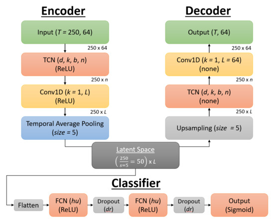 Once the autoencoder was trained for reconstruction, the weights of the encoder were locked and the encoder was then used to encode input sequences into latent features. The latent features were then flattened and used as input features into a FCN classifier. The TCN-AE architecture in its entirety can be seen in Figure 10. The FCN classifier had two hidden layers, each with the ReLU activation function, followed by a dropout layer, and a output layer using the sigmoid function. L2PO-CV was used for training and validation of the FCN for classification. The Adam optimizer [67] was used to train the models by minimizing the binary cross-entropy loss, and a hyperparameter sweep was performed over the number of hidden units for each layer, the dropout rate, and the learning rate.