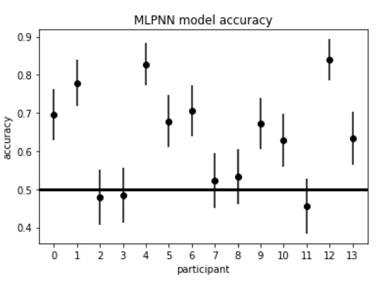 Hyperparameter sweeps for the MLPNN model resulted in the best network achieving a 7-fold CV balanced accuracy of 64% (95% CI: 0.59, 0.69) and 7-fold CV area under the receiver operating characteristic (AUROC) of 0.71 with the following hyperparameters: hidden units of (250, 200, 150) (by layer), learning rate of 0.00001, and dropout rate of 0.5. This results in the model having CV accuracy statistically greater than random chance as evidenced by the confidence interval. Figure 12 depicts the validation accuracies for each participant for the MLPNN model, with nine participants having validation accuracies statistically greater than random chance. Participants 2, 3, 7, 8, and 11 did not have validation accuracies greater than random chance.