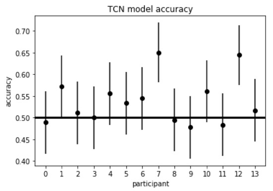 The best hyperparameter sweep for the TCN model yielded a 7-fold CV balanced accuracy of 56% (95% CI: 0.51, 0.61) and 7-fold CV AUROC of 0.57 with the following hyperparameters: dilations (1, 2, 4, 8, 16, 32), kernel size of 4, number of filters 10, number of blocks 2, learning rate of 0.0001, and dropout rate of 0.5; and resulted in a receptive field of . This results in the model having CV accuracy statistically greater than random chance as evidenced by the confidence interval. Figure 13 depicts the validation accuracies for each participant for the TCN model, with 3 participants (1, 7, and 12) having validation accuracies statistically greater than random chance.