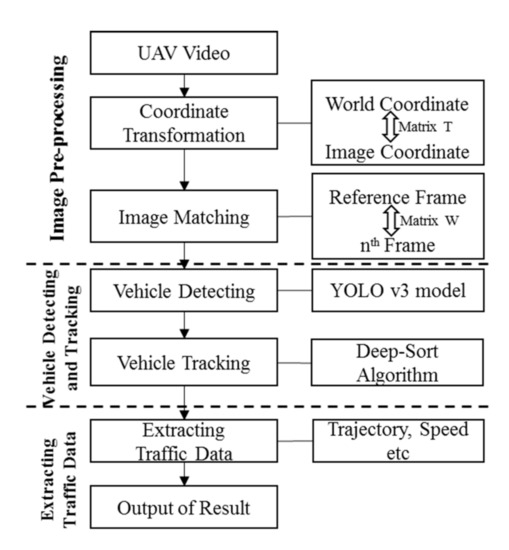 The general procedure of extracting vehicle-level traffic information from UAV video consists of three major steps: image pre-processing, vehicle detecting and tracking, and traffic parameters extraction. In the present work, the proposed approach for extracting traffic data is described in Figure 1. In the image pre-processing step, the uniform coordinate system metrics are determined by the transformation model. Then, a multi-object detection model making use of YOLO v3 and deep SORT is proposed to track vehicle position information over time, based on which critical parameters, such as vehicle trajectory and vehicle speed, are extracted according to the vehicle position information. Methodologies applied are introduced as follows. It should be noted that, in the present work, the overall traffic data extraction process is conducted off-line, as the major purpose of this work is to examine the performance of traffic monitoring when on-board vehicle information is provided. For the implementation, we use open-source Yolov3 with python to realize the proposed method.