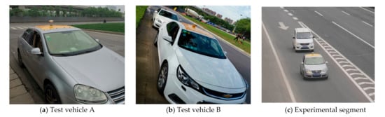 In Section 2, 2 test vehicles installed with high-precision on-board equipment are selected to collect the reference data needed for validation, as shown in Figure 4. To improve the reliability of experimental validation results, test vehicles were equipped with GNSS for high-precision positioning and an on-board unit (OBD) for collecting other vehicle travelling information. The Trimble SPS985 GNSS was selected to collect high-precision positioning data through the roadside base station, whose precision reached up to centimeter-level. The GNSS frequency was set as 20 Hz to ensure the precision of positioning data. OBD could record real-time vehicle travelling data by reading vehicle CAN and was connected to a cellphone APP through Bluetooth. Besides, OBD platform could record the app data. Therefore, the cross-validation could be realized using data obtained from GNSS and OBD, including speed, acceleration, deceleration, etc. Test vehicles used in the field experiment are shown in Figure 4.