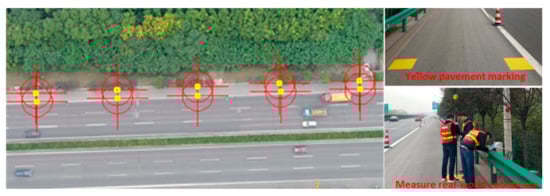 The field experiment was implemented on Xi’an Ring Expressway, in Xi’an, China. It should also be noted that the experiment was conducted under good weather conditions. The start location for testing is at the upstream of ZHANG-BA interchange exit and the testing section was about 1 km long. Furthermore, the 50 cm × 50 cm yellow pavement markings were pasted to measure the real-world coordinate at the interval of 50 m, which is a bridge between different coordinates. Totally, there were 386 marked points in the test segment to be measured and collected, shown in Figure 5. It should be noted that yellow pavement markings belonged to one type of road feature points used for solving the coordination transformation problem. While, in non-test situation, other road markings, such as dashed lane lines, road centerline, or deceleration markings, etc., could also be used as road feature points.