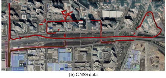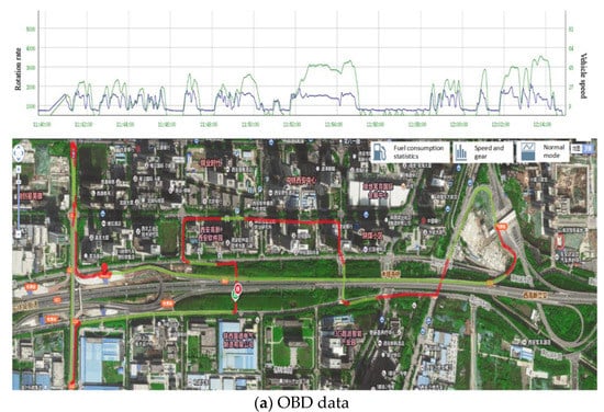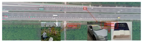 The whole process of the experiment can be presented in Figure 6, including installing the roadside base station, test vehicles, and UAV monitoring. Considering the weather, sunshine, wind, and peak-hour traffic flow, the experiment was chosen at the time from 10:30 am to 5:00 pm. There were seven groups of validation data to be collected at different situations through changing the UAV height and test vehicle speed. The flight height varied from 220 m to 500 m, and the corresponding segment length varied from 150 m to 350 m. The vehicle speed covered 40 km/h to 90 km/h, as shown in Table 2. The UAV height adopted in the present work was relatively higher than existing works. It should be further noted that, during the monitoring process, it was difficult for the test vehicles to always keep a certain driving speed. We then used a speed range as the control variable to test the performance of the proposed system. Each group hovered for 10 min, namely 70 min video data. However, the appearance time of test vehicle in each group experiment was approximately 30 s. A total of 5400 frames containing the test vehicle were produced in this experiment. The real-time data obtained from GNSS-RTK and OBD are shown in Figure 7.