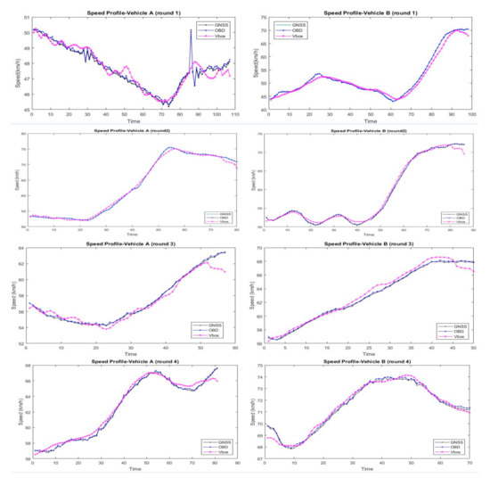 The maximum absolute error and relative error were used to measure the accuracy of the sample data. Based on the reference sample, the error of extracted data for test vehicle-A and vehicle-B can be calculated, shown in Table 5. There are 593 and 599 reference data for vehicle-A and vehicle-B, respectively. The results show that the maximum absolute error of vehicle-A and vehicle-B is 2.72 km/h and 2.99 km/h, respectively. The relative error of vehicle-A and vehicle-B is 0.85% and 1.03%, respectively. Based on the above analysis, the results indicate that the precision of the extracted speed reaches up to 98%, the absolute error is less than ±3 km/h, and the relative error falls within 2%. It should be noted that the results described in the present work were obtained under good weather conditions.