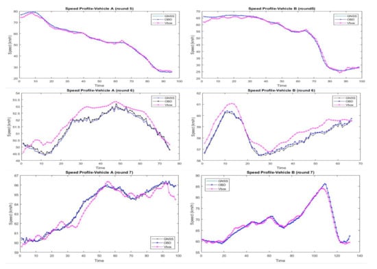 Based on the vehicle information detected and tracked by the above algorithm, the traffic data, for example, speed, trajectory, driving behavior, etc., can be extracted. Speed is one of the most important parameters for traffic safety. Therefore, it is selected to measure the accuracy of the extracted traffic data by comparing the GNSS and OBD data. Since the OBD data was recorded at the frequency of 5 Hz, while the GNSS was produced at the frequency of 20 Hz, we then interpolated the data obtained from these two sources. For example, there are OBD speed data at 11:00:00 a.m., 11:00:12 a.m., 11:00:24 a.m., 11:00:36 a.m., 11:00:48 a.m., and 11:01:00 a.m. While for GNSS data, the average value of adjacent timestamps (11:00:06 a.m., 11:00:09 a.m., 11:00:12 a.m., and 11:00: 15 a.m.) were taken as the value at timestamp (11:00:12 a.m.). The extracted speed data from the UAV video was integrated similarly. Totally, 1192 speed data were produced to evaluate the accuracy of the proposed approach. The comparison result of seven groups of validation experiments is shown in Figure 9.