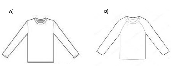 (A) T-shirt with set-in sleeve style, (B) t-shirt with raglan sleeve style.