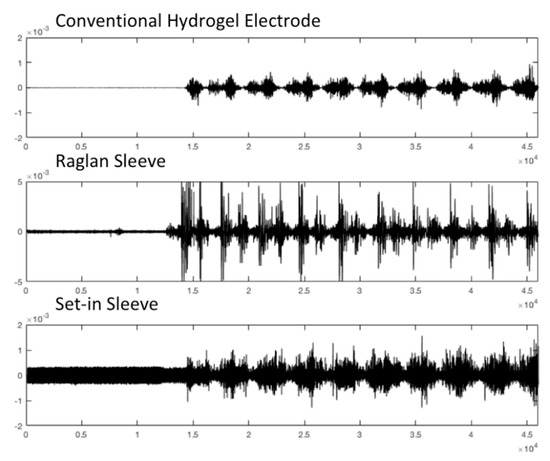 - The electrode–skin impedance spectrum analysis of e-textile electrodes in raglan sleeve condition shows a more consistent impedance spectrum across different frequencies and therefore relates to considerably higher signal-to-noise ratio of the measured EMG signal.
