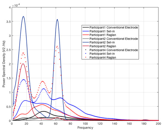 PSD distribution of EMG signals of participants with custom fit set-in sleeve, raglan sleeve and conventional electrode conditions.