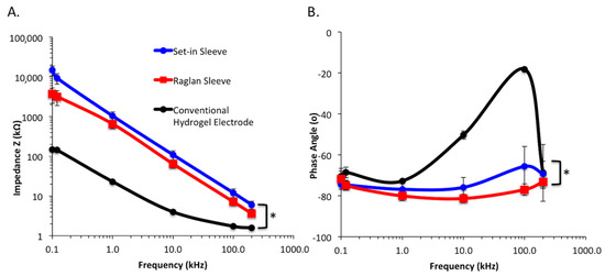 (A) The mean electrode–skin impedance spectrum and (B) the phase angle measured in different t-shirt conditions. * p < 0.05.