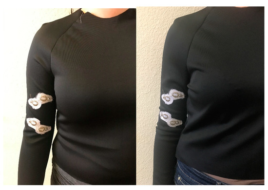 E-textile EMG electrodes were embroidered on the right sleeve pattern of each t-shirt prototype using the polyamide silver-plated Madeira HC 12 (<100 Ω/m) thread and a ZSK Sprint CAD embroidery machine. EMG electrodes were digitally modelled using Tajima DG15 by Pulse embroidery software with the satin stitch type which is a series of flat stitches that completely cover a section of the fabric. During the embroidery process under-stitching with non-conductive thread was used to create a stabilized fabric surface, then the electrode surface was embroidered on top with the Madeira HC12 conductive thread. The under-stitching also helped to add extra raised surface for the electrodes which was critical for better electrode–skin contact. Two embroidered EMG electrodes (anode and cathode) with a 20-mm diameter were located 40 mm apart from each other on the sleeve pattern to correspond to the location of the Biceps Brachii muscle of the arm; one embroidered EMG electrode (ground) was located to correspond to the Humerus elbow bone; two additional electrodes were embroidered for use to stimulate muscles (Figure 3). The electrodes were embroidered on the inner surface of the sleeve for direct contact with the skin and male side of metal snaps were clipped on the embroidered electrodes on the outer surface of the sleeve for connection to the Delsys snap EMG sensor system.