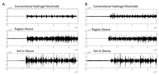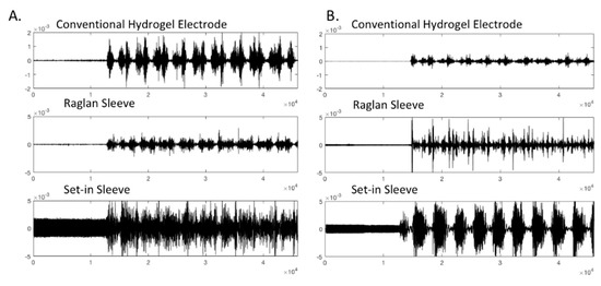 Raw EMG signals retrieved from custom fitted Participant 4 in conventional electrode and e-textile electrode in raglan and set-in sleeve conditions.