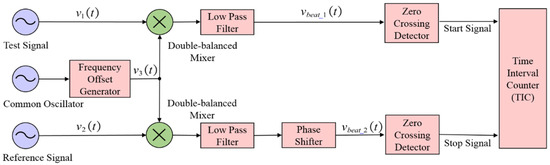 The DMTD method is a high-precision phase comparison technique that can be used to evaluate signal stability [17,18,19]. As can be seen from Figure 1, the test signal with the nominal frequency and reference signal with the same nominal frequency shown in the following formula is connected to the input port of the DMTD measurement system for time difference measurement.