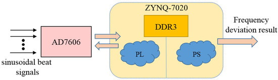 As shown in Figure 5, the analog-to-digital data acquisition system (DAS) is realized by AD7606, which supports 8 synchronous sampling inputs. The resolution of AD7606 is 16 bits, and the sampling rate of all channels is 200kSPS. The processor adopts Xilinx ZYNQ-7020 System-on-Chip (SoC) with a dual-core ARM Cortex-A9 processor and FPGA, which is divided into programmable logic (PL) and processor system (PS). The PL of ZYNQ-7020 drives AD7606 to realize data acquisition, and the collected data is transmitted to DDR3 SDRAM through direct memory access (DMA). In addition, the PL also performs multiplication and addition operations in the frequency measurement algorithm on the collected data. The PS of ZYNQ-7020. The PS of ZYNQ-7020 performs division and inverse cosine operation on the multiplication and addition result, and finally calculates the frequency deviation of sinusoidal beat signal between each measurement channel and reference channel.