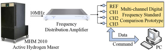 We have also established an experimental test platform to evaluate the frequency measurement accuracy and noise floor of the prototype. Figure 7 presents the experimental test platform diagram. A sinusoidal signal generated by an active hydrogen maser with a nominal frequency of 10 MHz is distributed to four channels by the frequency distribution amplifier. Then four sinusoidal signals are connected to the input port of one calibration channel and three measurement channels respectively. A Personal Computer (PC) is used to send commands to the prototype and receive the data of frequency calculation results.
