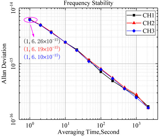 Noise Floor refers to the additional noise of the measuring equipment itself except the useful signal, which is usually characterized by Allan variance at 1 s in the field of time and frequency. Figure 9 shows the frequency stability of three measurement channels with systematic error elimination. For an input signal with the frequency 10 MHz, the noise floor test results of the three measurement channels of the prototype are 6.26 × 10−15/τ = 1 s, 6.19 × 10−15/τ = 1 s, and 6.10 × 10−15/τ = 1 s. Compared with Figure 10, the measurement results of the measurement channel are subtracted from the calibration channel, which eliminates the influence of noise from the device and improves the performance of frequency standard comparison. The noise floor of the prototype is low enough to be used to evaluate the ultra-stable frequency source with frequency stability of 1 × 10−14/τ = 1 s. Simultaneously, the Allan variance curves of the three channels are approximately coincident, which also shows that there is a high consistency between the channels.