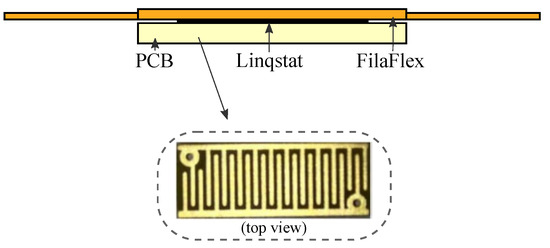 The FSR sensors are also custom. They are fabricated following a simple approach that consist of placing a sheet of the semiconductive material Linqstat (3M, Maplewood, MN, USA) on a small Printed Circuit Board (PCB) with two comb electrodes. A flexible layer printed with Filaflex (Recreus Industries S.L, Alicante, Spain) is placed atop this structure. Figure 3 shows a picture of the custom FSR and Figure 4 shows the resulting handle with sixteen integrated force sensors.
