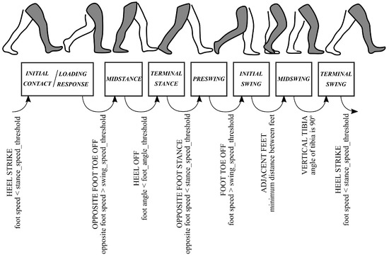 Figure 7 shows the algorithm that has been followed to split the stride into eight gait phases. For an eight phase granularity, the initial contact phase takes about the 8% of the gait cycle, so it has been merged with the loading response phase in this study. The parameters that have been used in this work are: m/s, m/s and °. The condition of adjacent feet is signaled when the distance between both feet is a minimum and is lower than a distance threshold of 0.4 m (this rule is added to increase the robustness of the detection). Finally, the condition of vertical tibia is given when the corresponding neuron provides an orientation of 90° with respect to the horizontal axis.