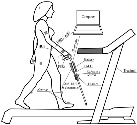 Figure 8 depicts the experimental setup that has been used to gather the data and obtain the results that will be presented in Section 5. The volunteer is equipped with the inertial sensing units (neurons) of the reference motion tracking system Perception Neuron. Another neuron is attached to the shaft of the cane, close to its own IMU, for synchronization purposes (see Section 4.3). The data collected by the PN units are sent to a hub in the belt and then to a computer via USB or WiFi. The instrumented cane described above sends also the information collected by its sensors to the computer, via Bluetooth in this case. A treadmill that allows the volunteer to walk at constant speed while using the cane completes the setup.