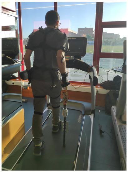 Before capturing data, they walked for some minutes on the treadmill to become familiar with the cane. Then, they were equipped with the 17 of the PN system to register the gait. With the setup ready, they walked on the treadmill for two minutes. Figure 9 shows a volunteer during the trials of the experiment design.