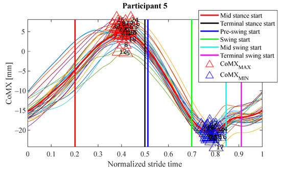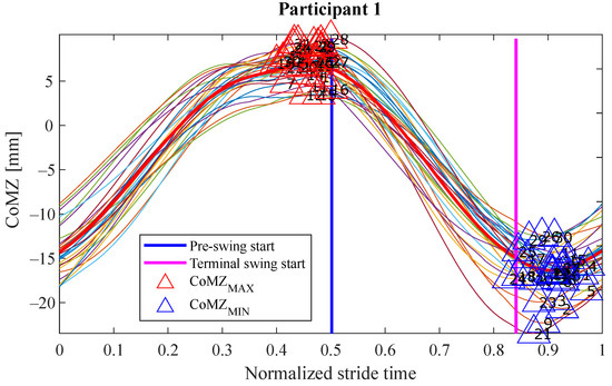 Evolution of the variable for the test carried out by P1. The duration of the strides has been normalized to ease the visual inspection (initial contact takes place at 0 in x-axis and the stride finishes at 1). The red line is the mean of considering all the gait cycles involved. The vertical lines represent the mean time in which those phases started. In this case, gait events can be seen just before the pre-swing phase and during the terminal swing phase, in form of maximums and minimums of , respectively. The former may be used to anticipate the pre-swing phase and the latter to do the same with the initial contact of the following stride (it would take place at 1 in x-axis).