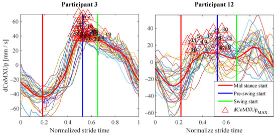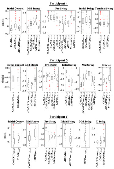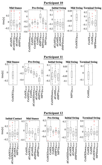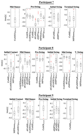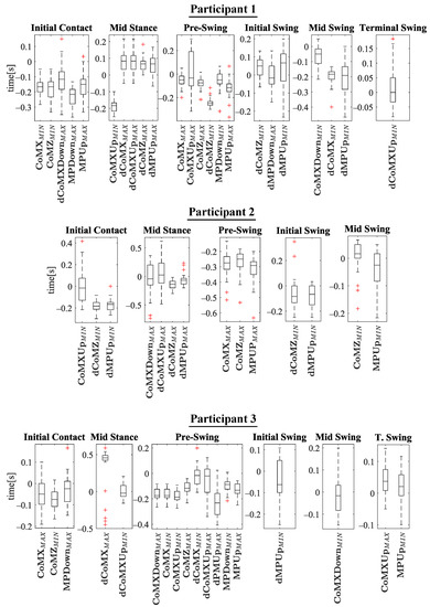 The experiments results are shown below in box plots for all the participants involved. The box plots gather the times in which relevant maximums or minimums of the studied variables appeared, taking as reference the beginning of the different gait phases provided by the PN system for each stride. This way, 0 s represents the phase start, negative values of time mean that the event occurs before the phase and positive values mean that it appears once the phase has started. Only the events that appeared at least in 25 out of the 30 strides were included. The prefix d is used to indicate that the parameter is the derivative with respect to time of one of the variables explained in Section 2.2 (for example, is the derivative of ). Figure 10 helps visualize how variables change over time during the gait cycles and how potential events appear.
