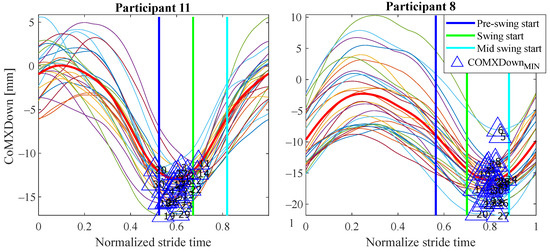 As can be seen, some events appear in the sames phases for many of the 12 participants, for example: for 10 volunteers, for 11 and for 10 in pre-swing; for 8 participants in mid stance; for 10 and for 10 in initial swing; or for 7 in terminal swing. Despite this, a significant inter-subject variability is observed. Several reasons may be behind it. For example, some of the variables are slightly time shifted between participants. This makes the same variable peak appear as gait event in different consecutive phases when comparing the tests. This is illustrated in Figure 16, where is shifted in time axis for P8 with respect to P11. This way, even if the evolution of the parameter is similar, in one case the event anticipates the swing phase and in the other mid swing. This may be explained by slight differences in the impaired leg − cane synchronization of the two volunteers (e.g., for one of the users, there may be a small angular lag between the leg and the cane when moving).