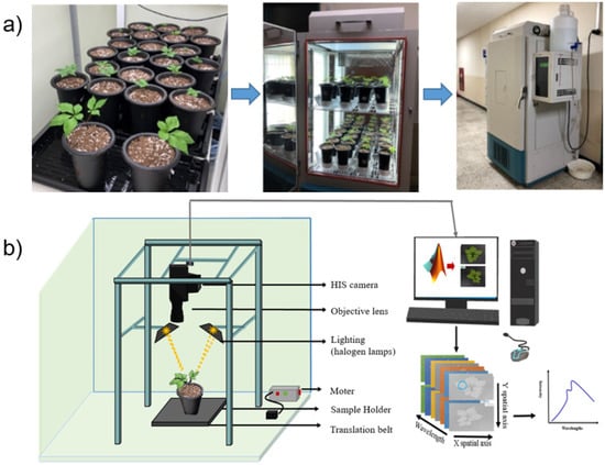In this work, two laboratory-based line scan HSI systems in different wave ranges, Vis/NIR (400–1000 nm) [22] and SWIR (1000–1800 nm) [23], were used in reflectance mode to collect the hyperspectral images of plant samples (Figure 1b). The spectral intensity beyond 1800 nm was significantly low and noisy, compared to the range of shorter wavelength. So, the spectral range beyond 1800 nm was not included for further analysis. When the operating system was stable, ginseng plants were manually placed on the translation stage and scanned line-by-line with the HSI camera. The HSI cameras were installed on standing platforms for both operating systems and began to collect HSI data as the ginseng plants approached the field of view of the camera. The distance between the camera and the samples was set to 26 cm. The ginseng plants were scanned in Vis/NIR and SWIR at a scanning speed of 6 mm/s. The collected raw HSI data were stored in a three-dimensional format comprising two spatial and one spectral dimension. After acquiring the HSI of plant samples, white and dark reference images were acquired from both VIS-NIR and SWIR for image calibration.