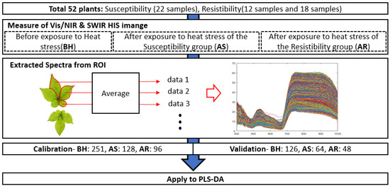 Vis/NIR and SWIR images of 52 samples were obtained (Figure 2). The obtained spectrum was extracted from the leaves of the ginseng plant in the image and the average of each leaf spectrum was determined as one sample data (about 20,000-48,000 pixels). The spectral data before heat stress exposure were a total of 377 samples (161 Chunpoong, 89 Sunmyoung and 127 Sunil). In addition, the spectral data after heat stress exposure included a total of 337 samples (144 Chunpoong, 87 Sunmyoung and 106 Sunil). Based on the obtained spectral data, ginseng plants were divided into three groups—all plant samples before exposure to heat stress (BH), the susceptibility group after exposure to heat stress (AS) and the resistibility group after exposure to heat stress (AR). For calibration, the total number of samples was divided into 251 samples of BH, 128 samples of AS and 96 samples of AR. For validation, the total number of samples was divided into 126 samples of BH, 64 samples of AR and 48 samples of AS. Matlab (Version R2019a, Mathworks, Natick, MA, USA) was used for all data processing.