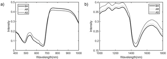 The average spectra of Vis/NIR and SWIR of the BH, AR and AS groups of ginseng plants are shown in Figure 3. In the visible region (from 400 nm to 700 nm), BH and AR showed very similar average spectral intensities (Figure 3a). On the other hand, in the case of AS, it was observed that the intensity increased more than BH. This observation indicated that BH and AS could be distinguished when exposed to heat stress in the visible area. In the NIR region (700 nm–1000 nm), an intensity difference between the BH and the heat stress-exposed groups (AS and AR) was observed. Therefore, the NIR region can distinguish between samples before and after exposure to heat stress. In the SWIR region, the intensity of BH was lowest at 1000 nm–1300 nm and 1600 nm–1800 nm (Figure 3b). On the other hand, AR had a larger intensity than BH and AS had a larger intensity than AR. These results indicate a possibility of distinguishing between ginseng exposure and resistance to heat stress in the SWIR region.