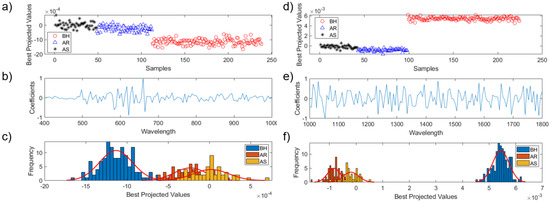 Figure 4d shows the distribution for each group and Figure 4e the coefficients of the waveband. Figure 4f shows the histogram of the distribution for each group when LDA was performed for SWIR data. Each group can be represented as 0 (BH), 89 (AS) and 100 (AR) based on the central value of the normal distribution of BF in Figure 4c. Therefore, these reference values were given to the respective SWIR spectral data for ginseng plants.