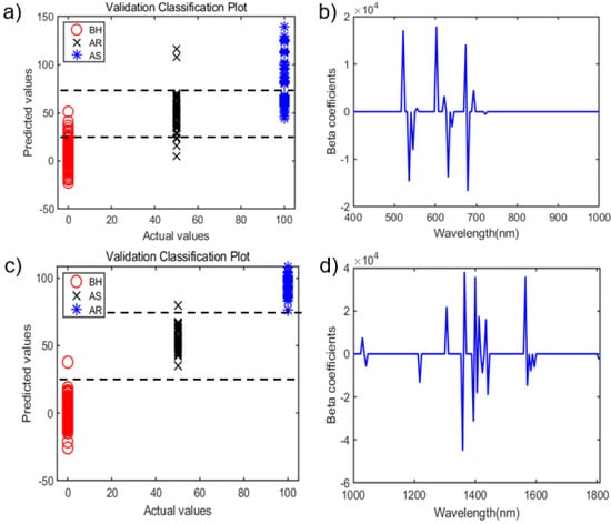 SPRI value of PLS-DA results of the 12 bands of spectra in Vis/NIR and of 18 bands of spectra in SWIR. (a) Classification plot of validation in Vis/NIR. (b) Beta coefficients of PLS-DA in Vis/NIR. (c) Classification plot of validation in SWIR. (d) Beta coefficients of PLS-DA in SWIR.
