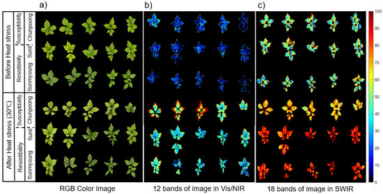 Figure 6c shows the results of imaging based on the selected 18 waveband weights in SWIR. An 18-waveband image can distinguish samples before and after heat stress in terms of susceptibility and resistibility, compared to an RGB color image. Therefore, the SWIR area is essential for distinguishing between heat stress exposure and resistance.