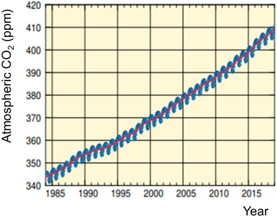 Globally averaged monthly mean mole fraction of CO2 from 1984 to 2018 and the deseasonalized long-term trend shown as a red line (Adapted with permission from Ref. [2]. Copyright 2020 WMO WDCGG).