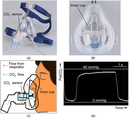 A system of measuring end-tidal PCO2 during non-invasive positive pressure ventilation. (a) Mainstream CO2 sensor (TG-980P, Nihon Kohden, Tokyo, Japan) is used in a mask (cap-ONE, Nihon Kohden, Tokyo, Japan). (b) The inner cup is attached inside the mask. (c) Air flow from respirator and exhaled flow from mouth or nose are shown. (d) Capnographic waveform on the monitor of non-invasive positive pressure ventilator (NKV-330, Nihon Kohden, Tokyo, Japan) is shown.