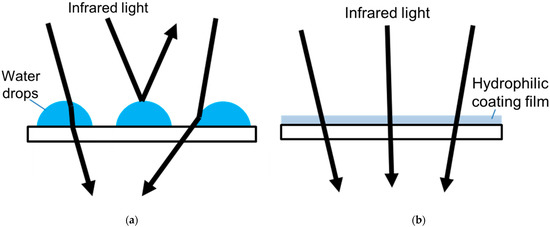 Technology of size reduction of end-tidal PCO2 sensors. In the new CO2 sensor, the use of heaters to avoid water drops is unnecessary. (a) In ordinary CO2 sensors, heaters are necessary to prevent windows from being clouded by water vapor in expired air. Water drops on windows cause refraction and reflection of infrared lights. (b) The hydrophilic coating film used in the new CO2 sensor (TG-980P, Nihon Kohden, Tokyo, Japan) disabled the surface tension of water drops. Thanks to this anti-fog film, the new sensor does not require the use of heaters.