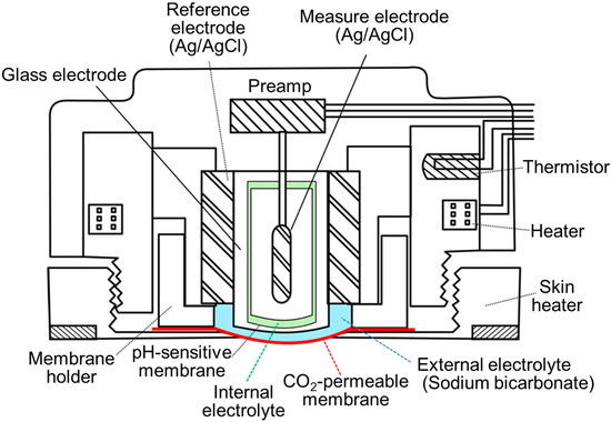 Transcutaneous PCO2 sensor. The skin heater is necessary in addition to the Severinghaus electrode (Adapted with permission from Ref. [73]. Copyright 1983 Japanese Society for Medical and Biological Engineering). An ultra-thin film of buffer electrolyte (light green) is placed between the silver and glass. This internal electrolyte stabilizes the pH inside the glass electrode. The external electrolyte (light blue) contains sodium bicarbonate. According to the manufacturing companies, the precise blueprints of recent products differ.