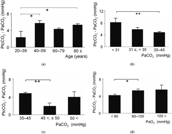 Comparison of the PtcCO2 bias between four age groups: 20–39 years (n = 11); 40–59 years (n = 12); 60–79 years (n = 138); and ≥80 years (n = 111) (Figure 8a). The PtcCO2 bias was significantly lower in young adults (20–39 years) versus those aged 40–59 years and ≥80 years (p < 0.05, respectively). PtcCO2 and PtcO2 are frequently utilized in newborns. The increases in PtcCO2 bias induced by aging may be due to the thickness of the skin with increasingly reduced permeability to gas exchange.