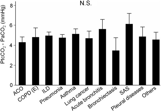 Subgroup analyses on PCO2 bias (PtcCO2—PaCO2) of patients with various respirtory diseases (n = 272). Bars: SEM. There were no significant differences in PCO2 bias (ANOVA with Tukey’s post hoc test). ACO, asthma-chronic obstructive pulmonary disease overlap; ANOVA, analysis of variance; COPD, chronic obstructive pulmonary disease; E, emphysema; ILD, interstitial lung disease; N.S., not significant; PaCO2, arterial partial pressure of CO2; PCO2, partial pressure of CO2; PtcCO2, transcutaneous partial pressure of CO2; SAS, sleep apnea syndrome ([89], additional data).