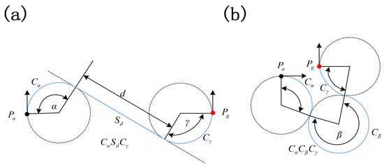 The Dubins path [,,] is the shortest path between any two configurations, and can be more precisely characterized as: , and , where L denotes “turn left”, R denotes “turn right”, and S denotes “go straight”. The six classes of Dubins path mentioned can be divided into and curves, which are shown in Figure 1.