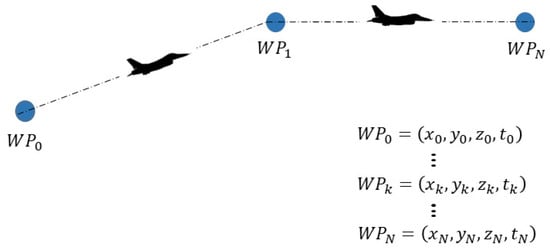 4D waypoints are waypoints with attributes of coordinates (latitude, longitude, altitude) and arrival time, as shown in Figure 2, wherein an aircraft is flying through a series of 4D waypoints. A 4D waypoint can be defined as: , where are the longitude, latitude, altitude, and arrival time of aircraft at 4D waypoint , respectively.