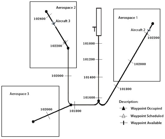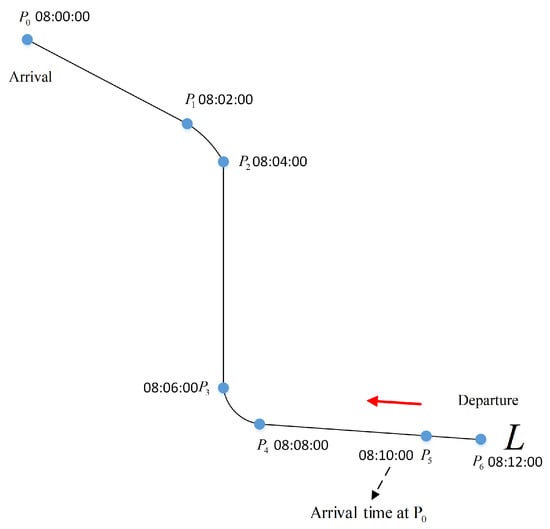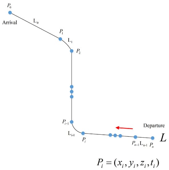 where is the current time of . The interval between 4D waypoints is determined according to the actual airline requirements. Figure 4 shows a series of 4D waypoints. For example, if the current time at is 08:00:00 and is 2 min, the arrival time at of an aircraft departure from can be calculated by (11), which is 08:12:00.