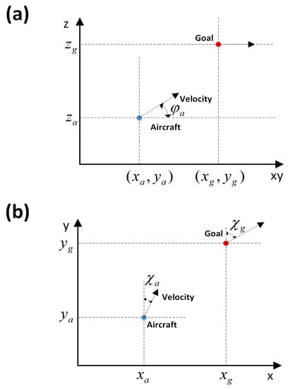 where Δx denotes the delta longitude of the target and the aircraft Δy denotes the delta latitude of the target and the aircraft, represents the aircraft heading, and represents the goal heading. The domain of , and are and , in degrees, respectively.