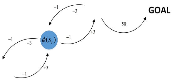 RL research belongs to the category of Markov decision process (MDP) [], which attempts to solve the problem of decision optimization and can be defined as , where S is the set of environment states; A is all possible actions the agent can select from the environment; R is the set of obtained rewards from the environment; P is the transition probabilities function; is the discount factor that determines the contribution of future rewards. , and respectively represent the current state, selected action, transition probability, and reward obtained from the environment.