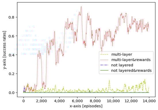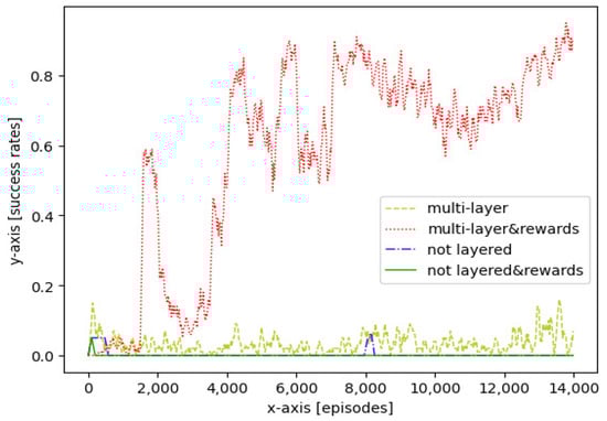 The multi-layer RL approach with reward shaping quickly reached a high success rate at 90% before 8000 training episodes, compared with other approaches. Furthermore, the success rate reached the maximum at around 95% before 14,000 training episodes. Compared with the former approach, without reward shaping, the multi-layer RL approach remained at a low success rate of less than 20%, which suggested a lower efficiency in exploring and exploiting. However, compared with not layered approaches, the multi-layer approach showed a significant performance in the success rate. The curves of the non-layered approaches showed that they cannot achieve the goal without the multi-layer approach because of the sparse rewards and local regions of the applications.