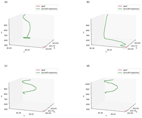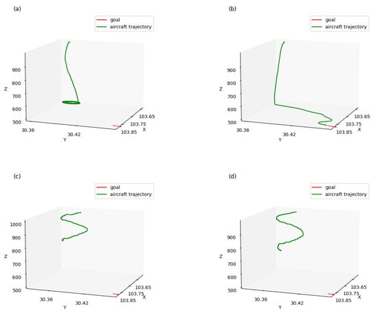 As shown in Figure 11a, when using a multi-layer approach without reward shaping, the aircraft reached its goal in altitude but kept whirling and failed to reach the goal position. In Figure 11c,d, when the multi-layered approach was not used, the aircraft kept whirling and failed to reach the goal in both altitude and position. Compared with the former approaches, shown in Figure 11b, when using a multi-layer approach with reward shaping, the aircraft successfully reached its goal in both altitude and position, which demonstrated that the performance of aircraft guidance could be significantly improved using a multi-layer approach with reward shaping.